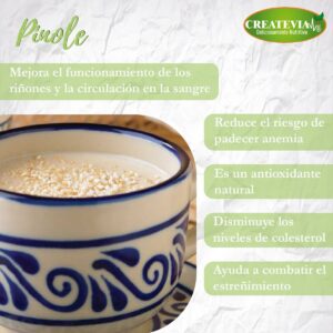 El pinole es rica fuente de energía, aporta hierro magnesio, fosforo, potasio, zinc, ayuda a prevenir enfermedades del corazón y riñón, es rico en antioxidantes, previniendo la producción de células cancerígenas, regula la digestión y combate el estreñimiento.